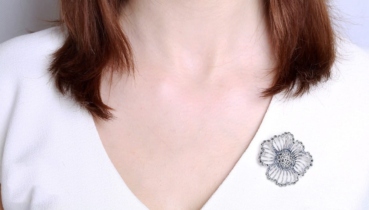Jedną z wyjątkowych zalet naszej broszki srebrnej z kwiatem jest to, że można wykorzystać ją jako zawieszkę do naszyjnika bądź bransoletki.