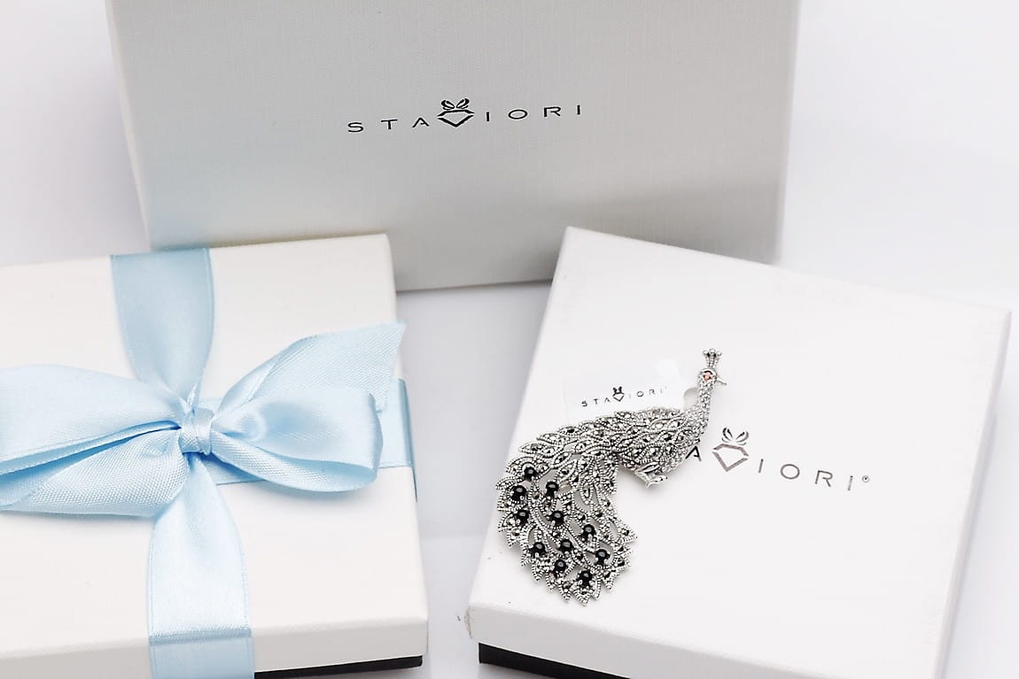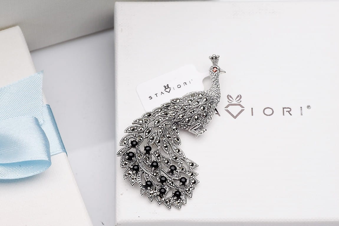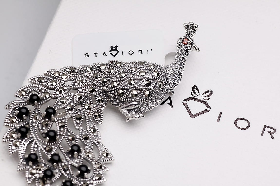 Broszka Paw ze srebra z onyksem i markazytami - Pavone Grande to piękny biżuteryjny dodatek od marki Staviori. Marka ta zawsze stawia na najwyższą jakość produktu i najprecyzyjniejsze wykonanie.