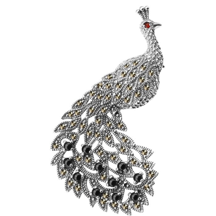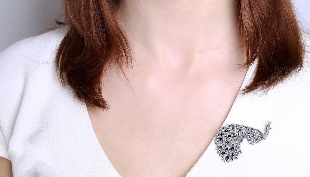 Srebrna Broszka Paw z markazytami - jak nosić?