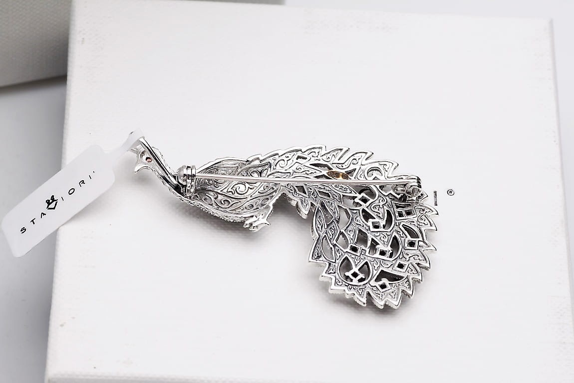 Broszka Paw ze srebra rodowanego 925 wypełniona jest pięknymi zdobieniami takimi jak: