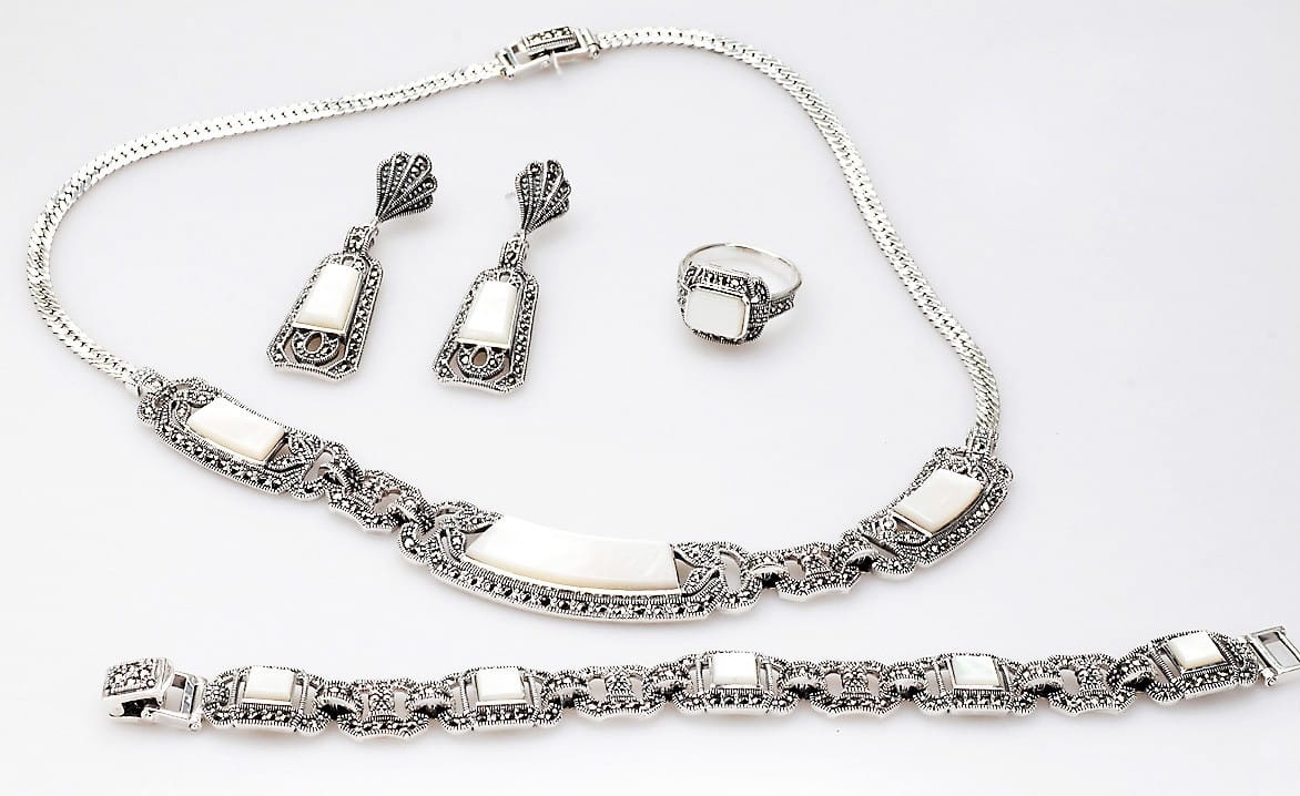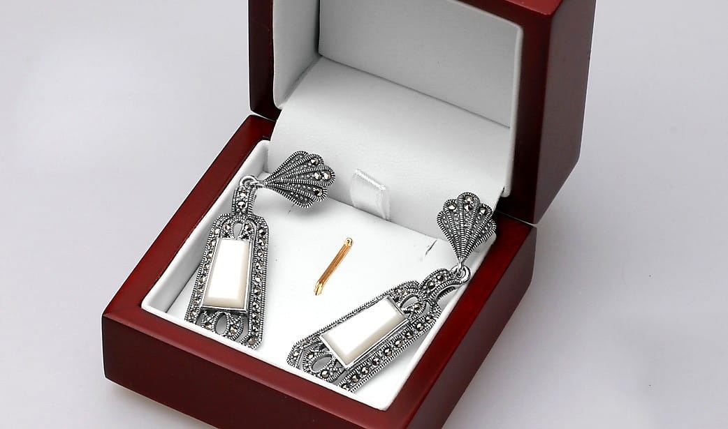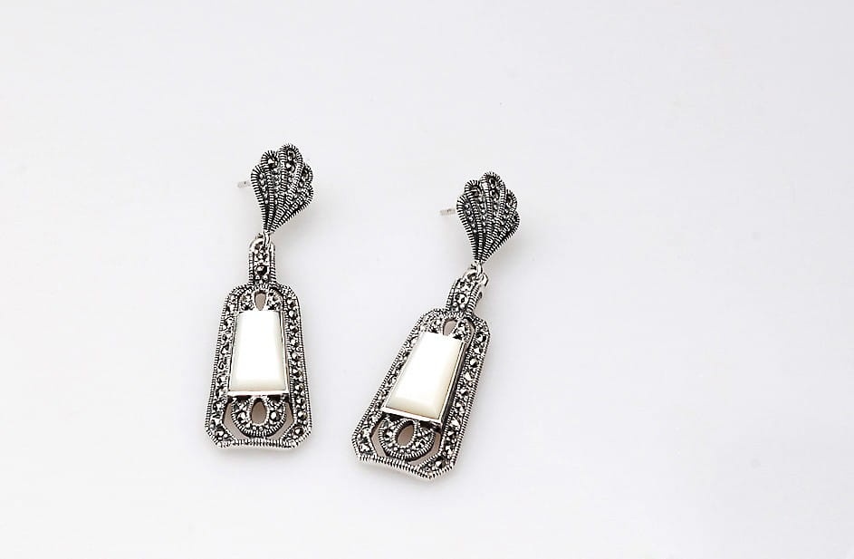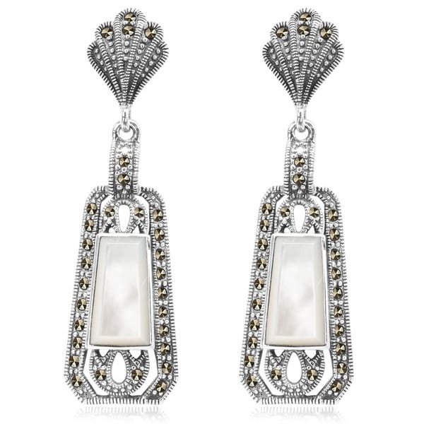 Staviori Kolczyki. Markazyty. Masa Perłowa. Srebro rodowane 0,925. Długość 52 mm. Szerokość 15,2 mm.