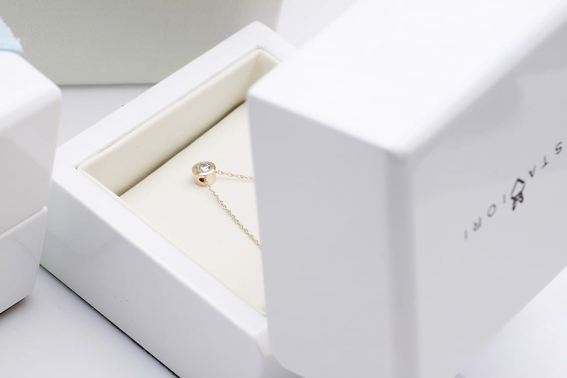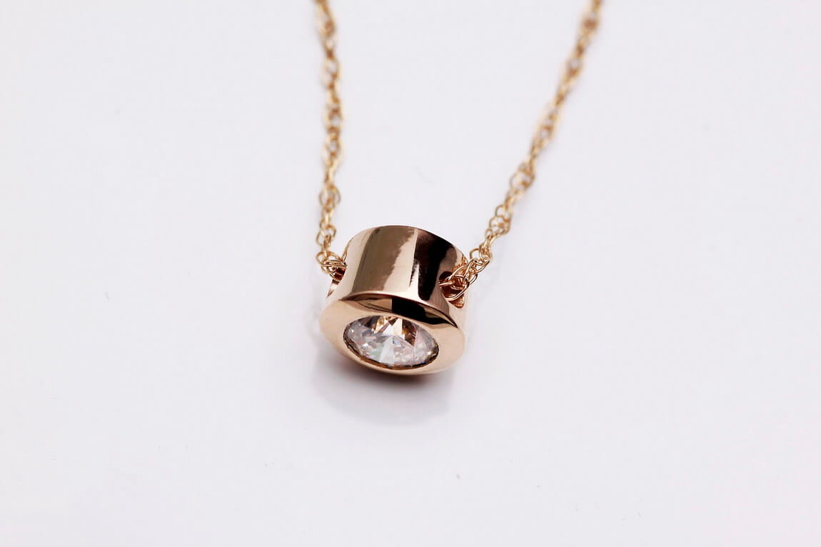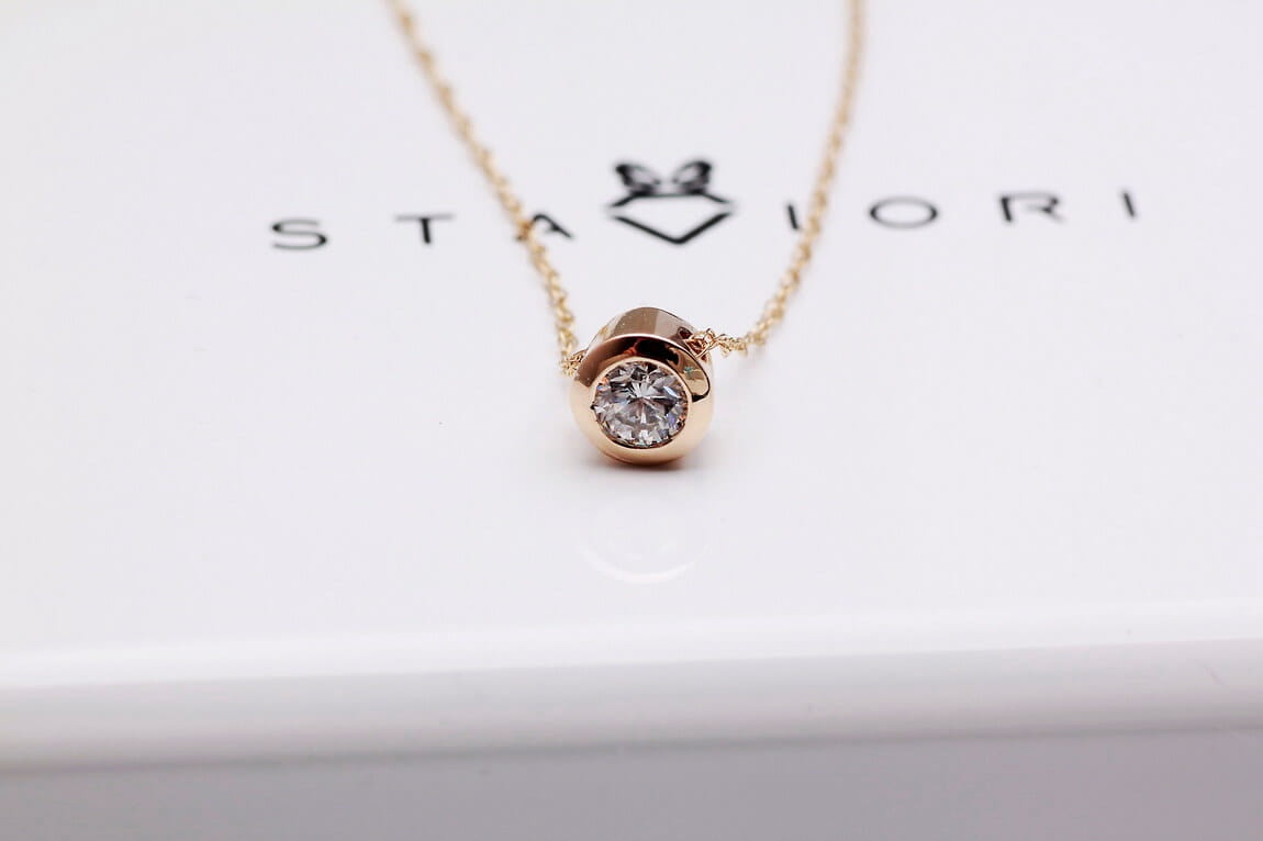 Staviori Naszyjnik 43cm. 1 Diament, szlif brylantowy, masa 0,15 ct., barwa G, czystość SI1. Żółte Złoto 0,585. Średnica 4,93 mm. Grubość 3,5 mm. Długość regulowana 40cm lub 43cm. Dostępny na zamówienie, czas realizacji ok. 1 tydzień
