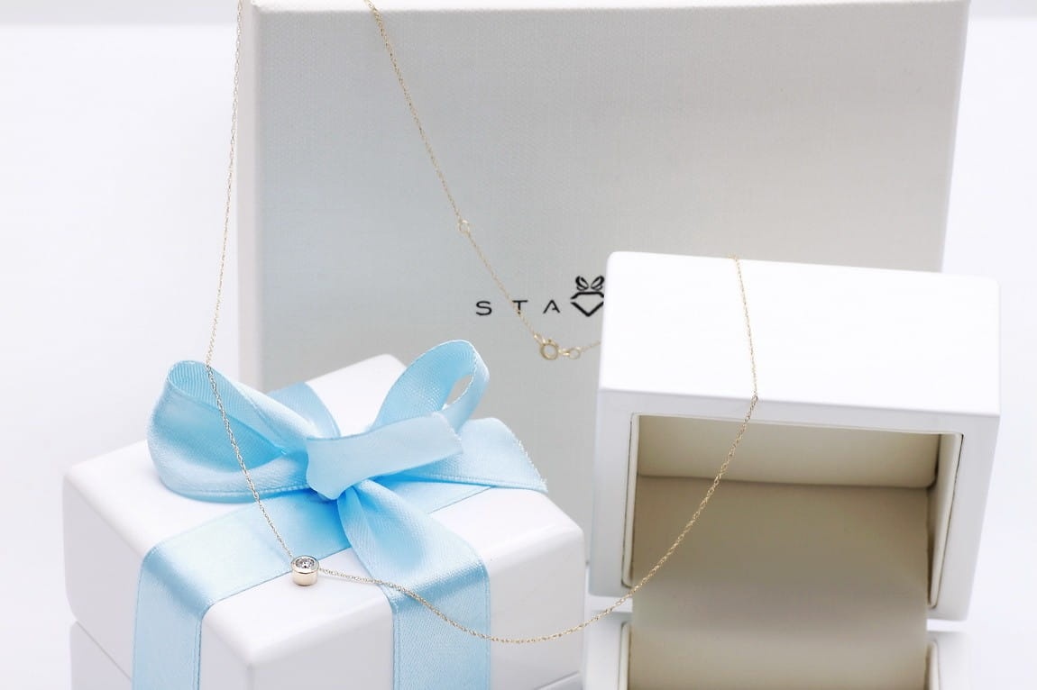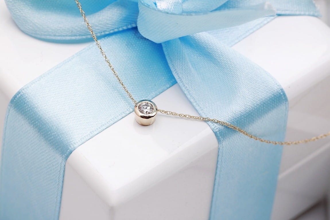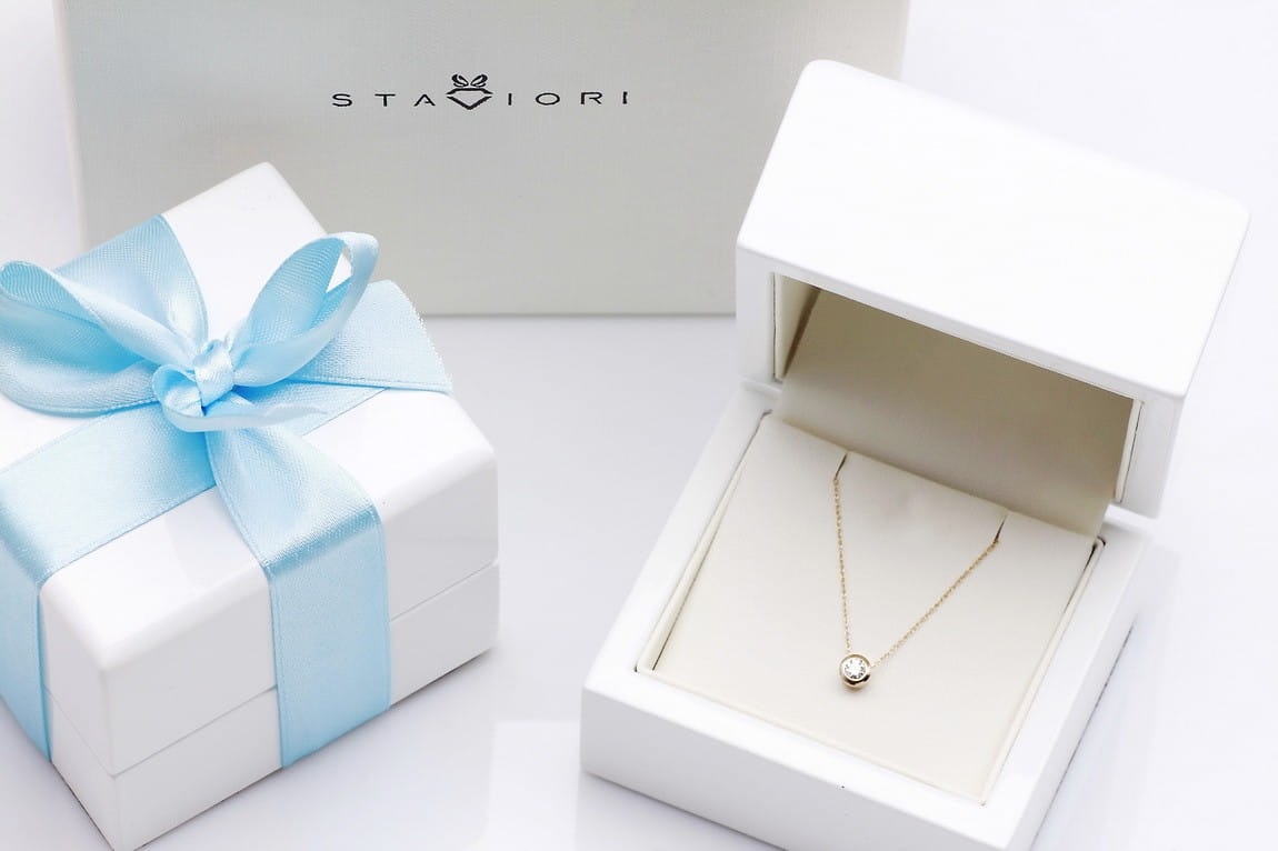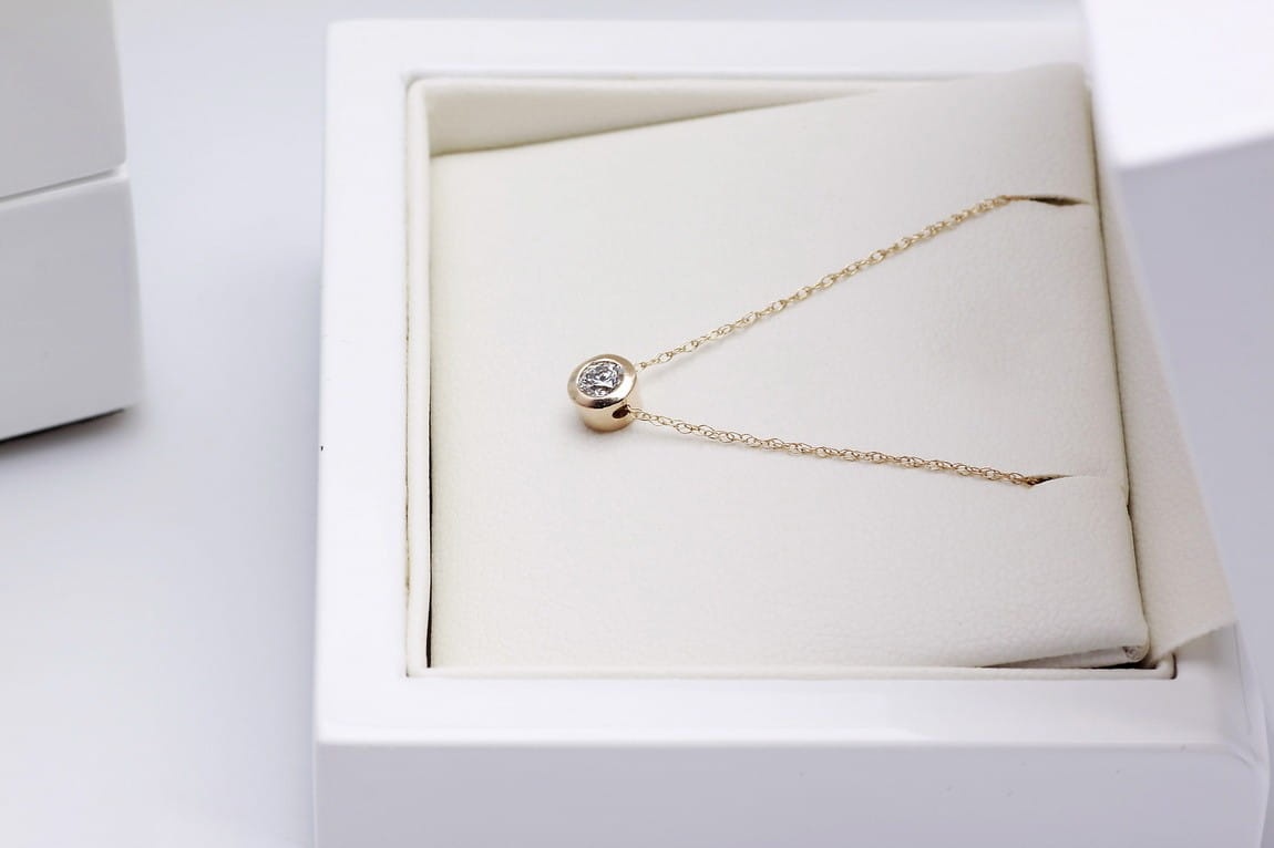Staviori Naszyjnik 43cm. 1 Diament, szlif brylantowy, masa 0,15 ct., barwa G, czystość SI1. Żółte Złoto 0,585. Średnica 4,93 mm. Grubość 3,5 mm. Długość regulowana 40cm lub 43cm. Dostępny na zamówienie, czas realizacji ok. 1 tydzień