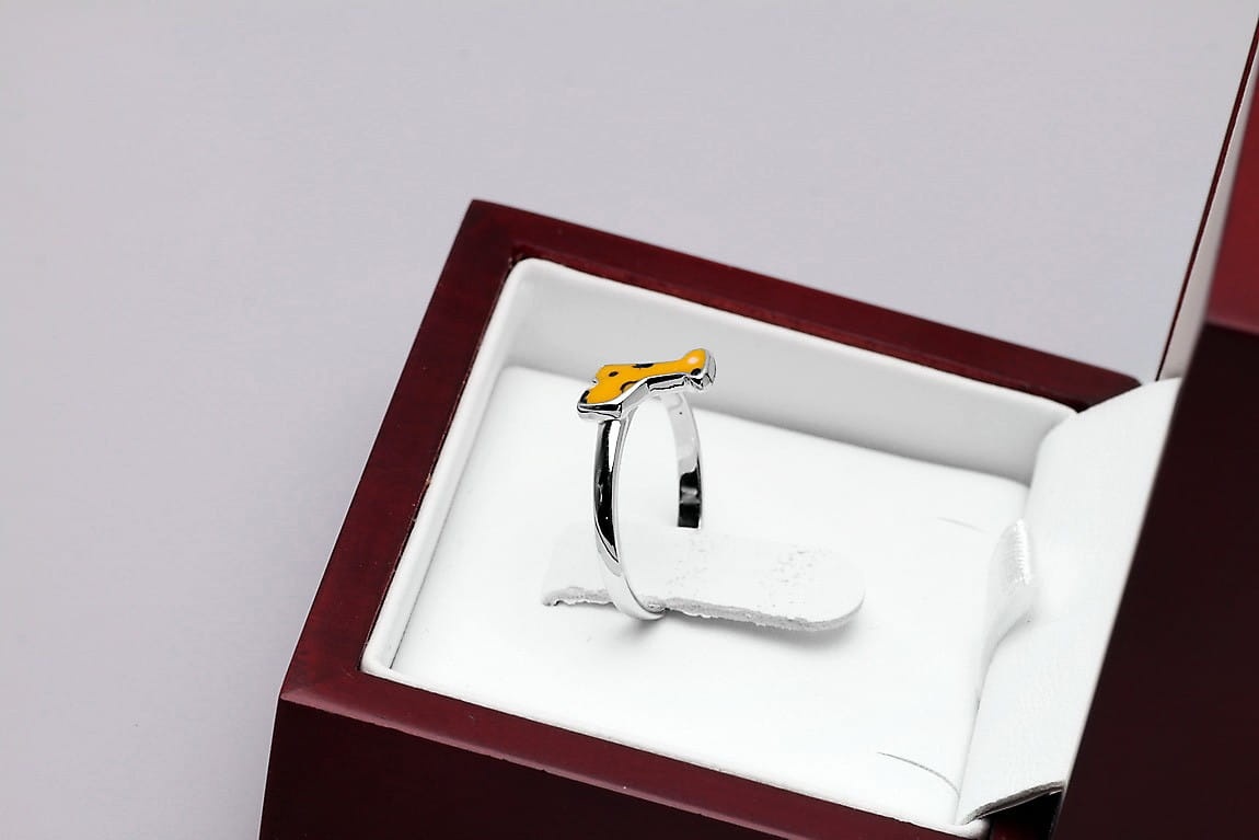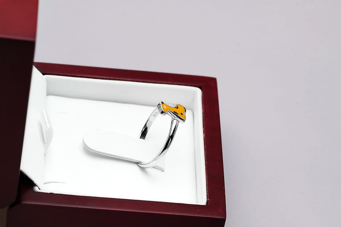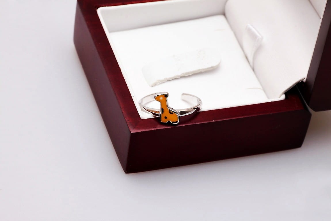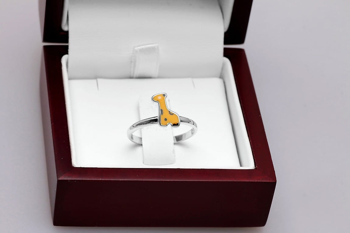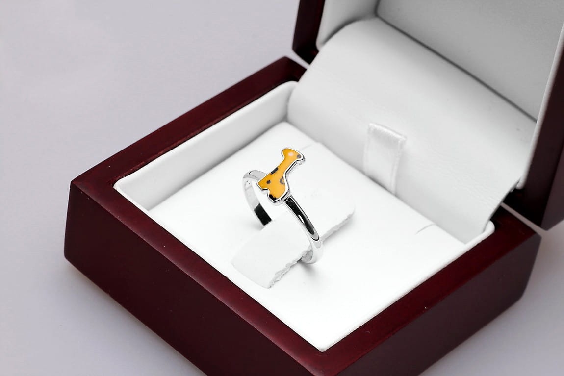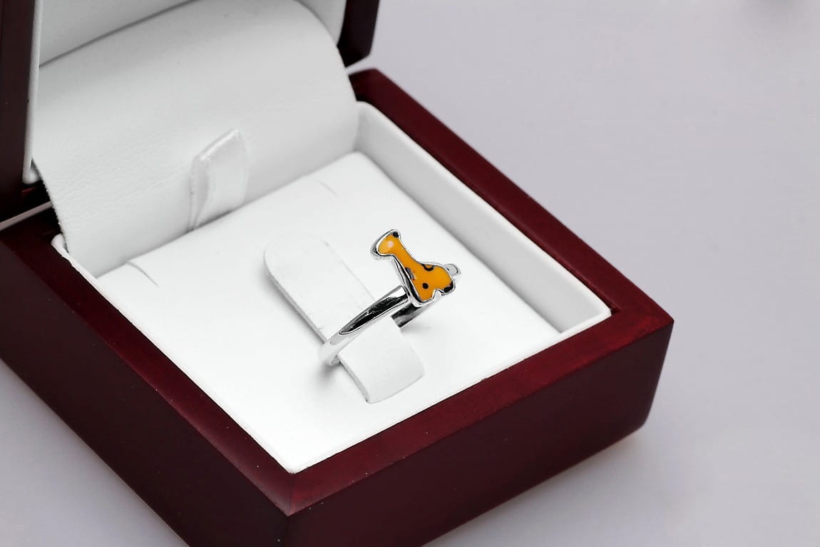 Pierścionek z motywem Żyrafy to prawdziwa biżuteria dla dzieci. Można dopasować go do palca każdej dziewczynki, dzięki regulowanej obrączce wykonanej z najwyższej jakości srebra 0,925. Dodatkowo, ozdobna żyrafa o emaliowanej powierzchni, zachwyca intensywnymi kolorami w żółtym i brązowym odcieniu. Plamy koloru swoim położeniem imitują jej naturalne umaszczenie. Każdy szczegół został dopracowany z najwyższą jakością po to, aby zachwycać serca posiadaczek!