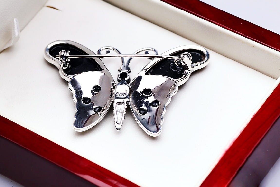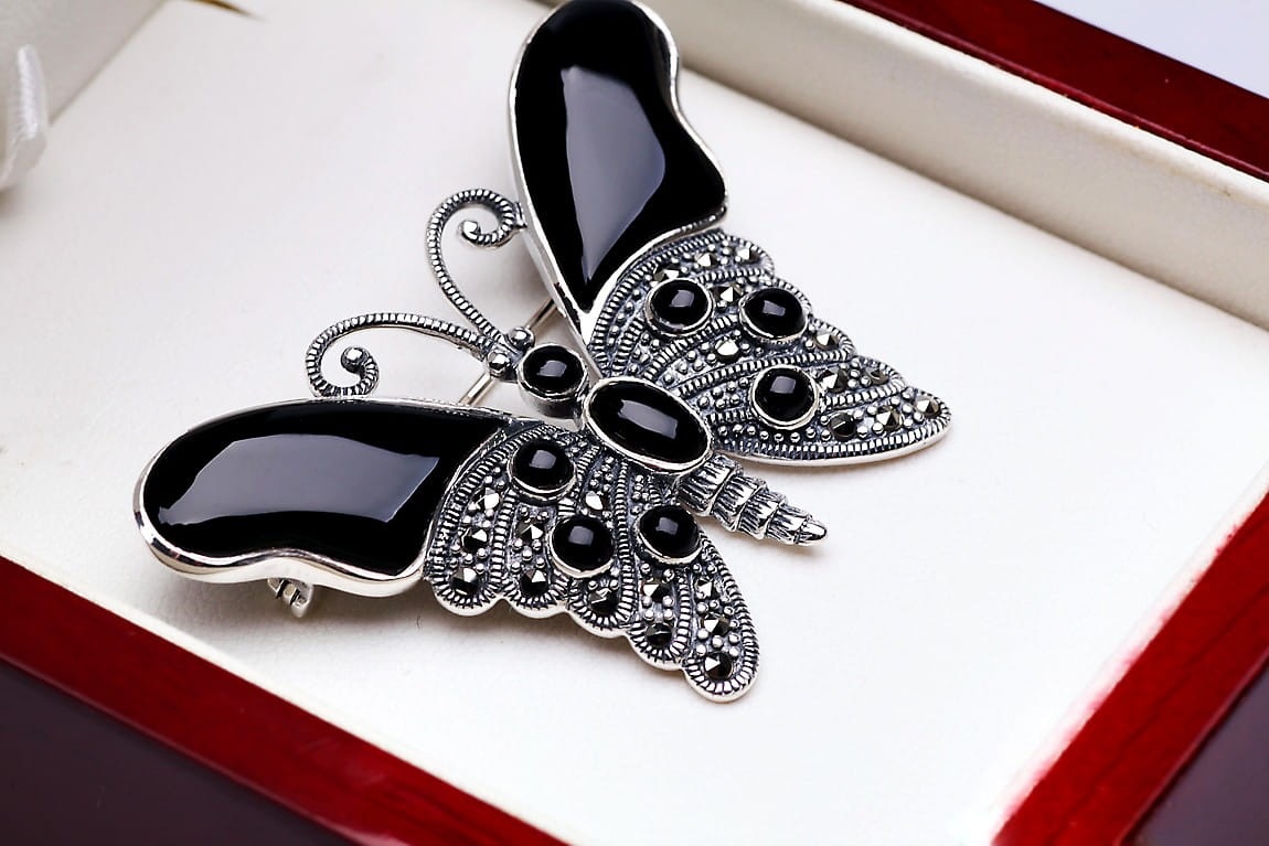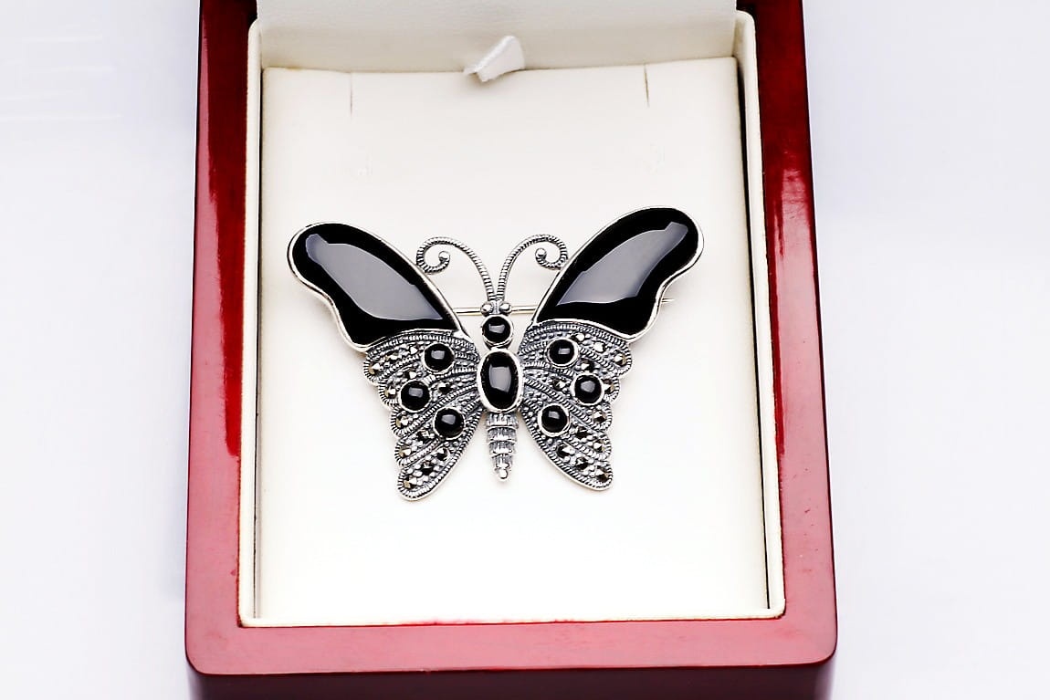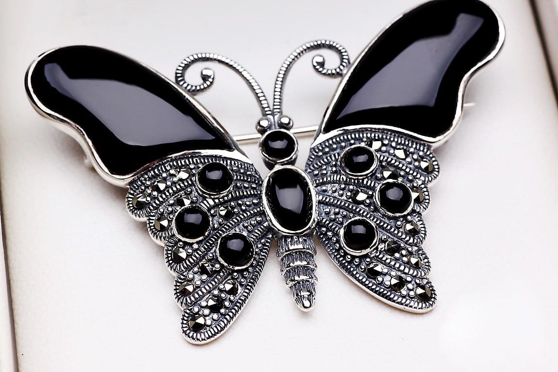 Srebrna broszka Motyl z Onyksem - z miłości do świata przyrody