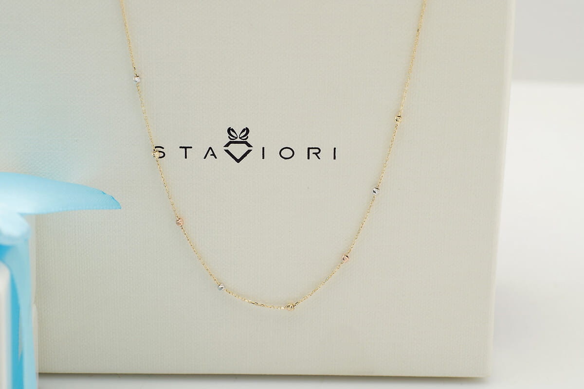 Naszyjnik 38cm. Żółte, Białe, Różowe Złoto 0,585. Średnica kulki 1,5 mm. Długość regulowana 38cm - 40,5cm.